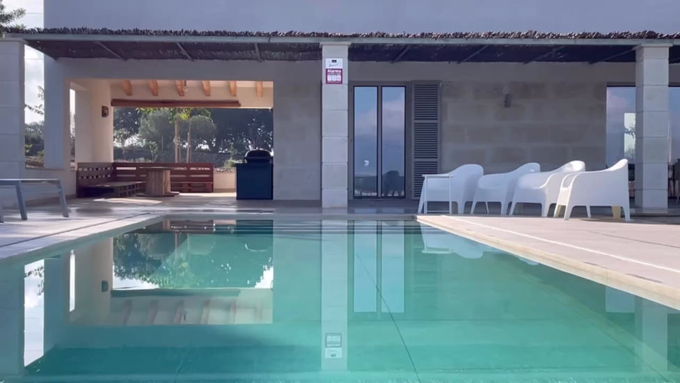 La casa tiene un gran porche de 25 m2 frente a la piscina de hidrólisis salina con terraza solarium de 100 m2, ducha, zona de BBQ y chillout. Los grandes ventanales enmarcan las vistas al jardín y a la piscina, creando
